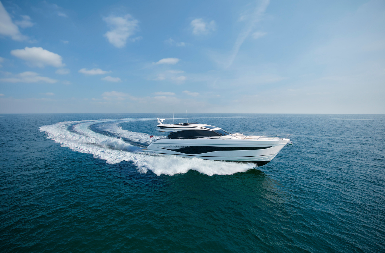 The 72-foot motor yacht takes its inspiration from the Y72 but follows the distinct personality seen on Princess’ sporty S Class range: powerful and precise - yet timelessly elegant and sophisticated, blending iconic design, exceptional engineering and unrivalled craftsmanship. “The Princess design team wanted to guarantee that there was no compromise in the new variant due to the fact that it’s built on the same platform as the Y72. In contrast to the Y class where it focuses on big interior, air-conditioned volume and a huge flybridge deck, the S class sees a little bit of reduced space up on the flybridge which gives it a sportier look and feel” says Andy Lawrence, Design Director at Princess Yachts. “We’ve also moved the patio door forwards about a metre and a half, and what that does is reduces the size of the interior upper accommodation volume and gives that space back to the cockpit deck area.”